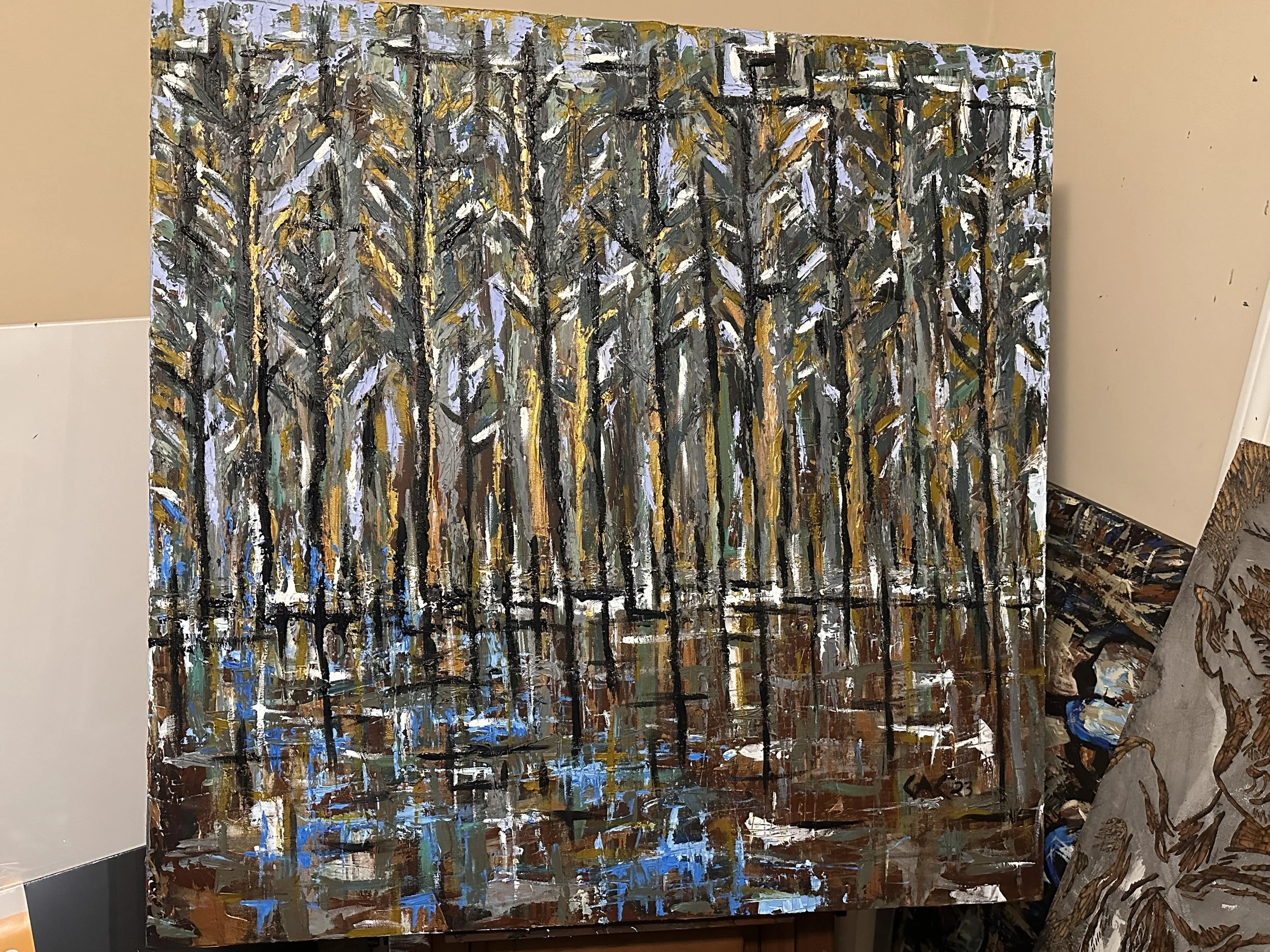 Industrial forest flowing river 1 40x40 inches $2000 plus shipping